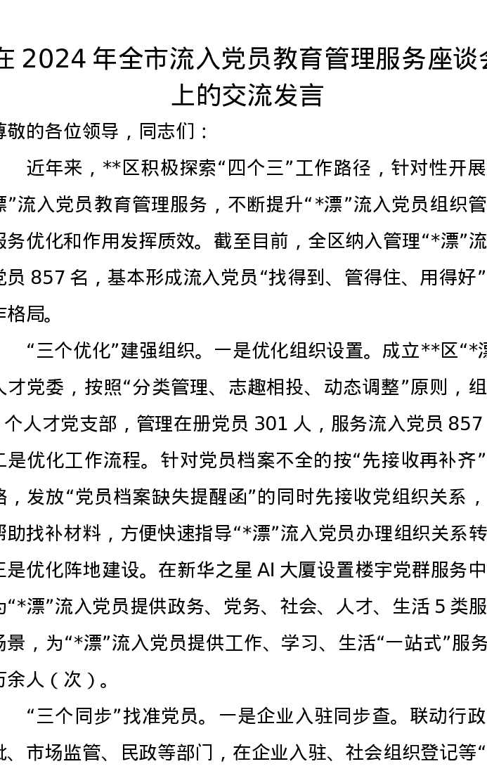 在2024年全市流入党员教育管理服务座谈会上的交流发言