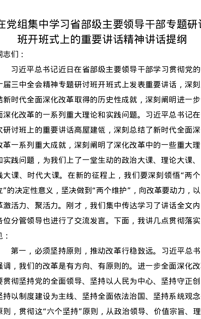在党组集中学习省部级主要领导干部专题研讨班开班式上的重要讲话精神讲话提纲
