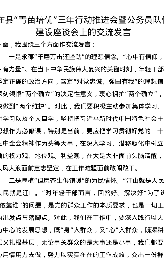 在县“青苗培优”三年行动推进会暨公务员队伍建设座谈会上的交流发言