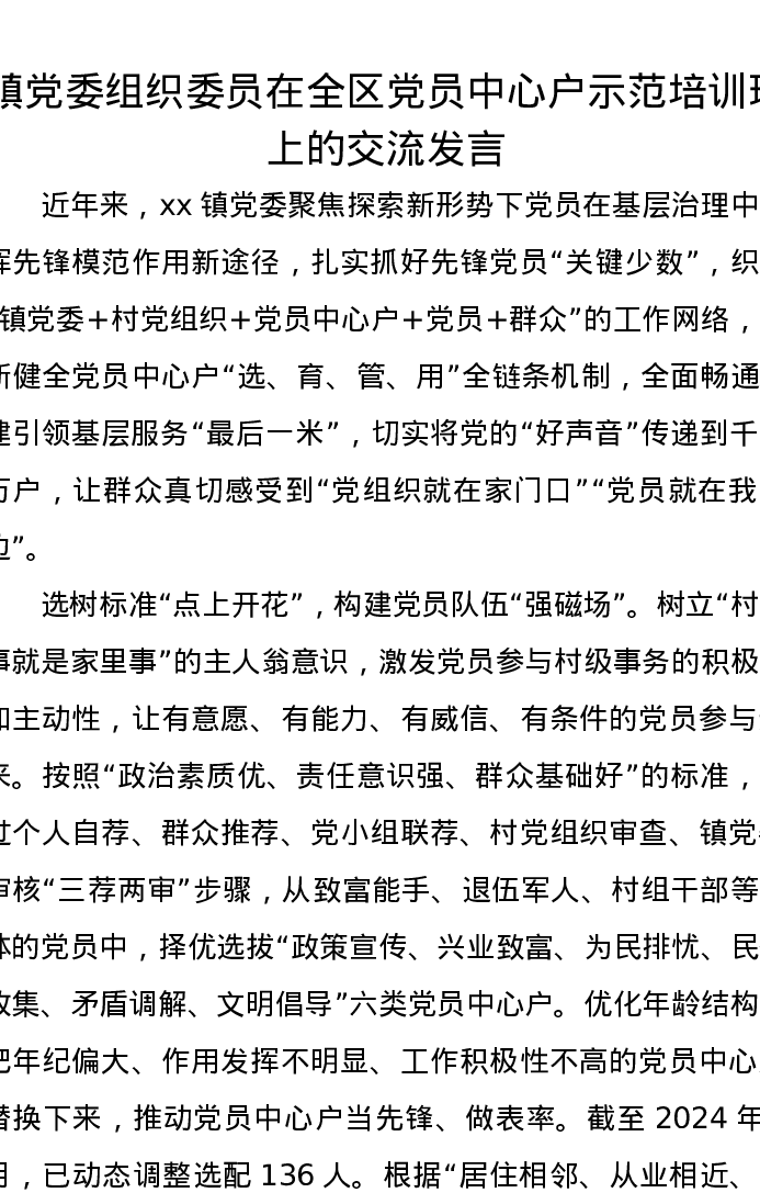 镇党委组织委员在全区党员中心户示范培训班上的交流发言