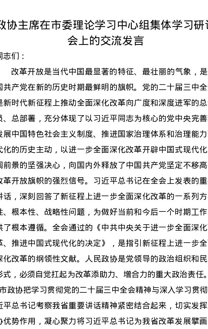 政协主席在市委理论学习中心组集体学习研讨会上的交流发言