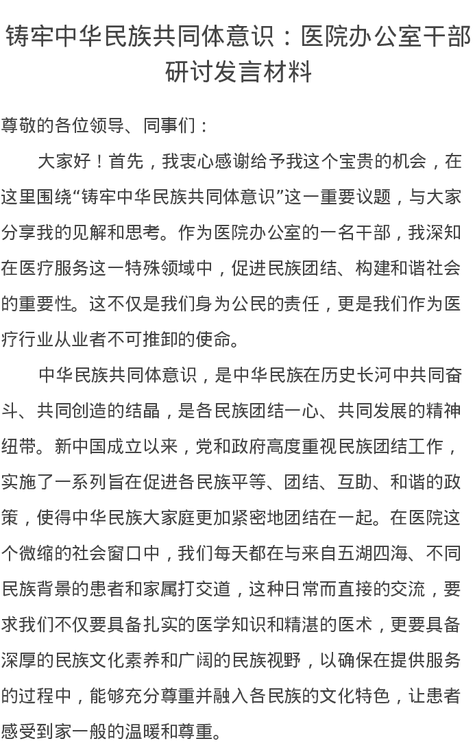 铸牢中华民族共同体意识:医院办公室干部研讨发言材料
