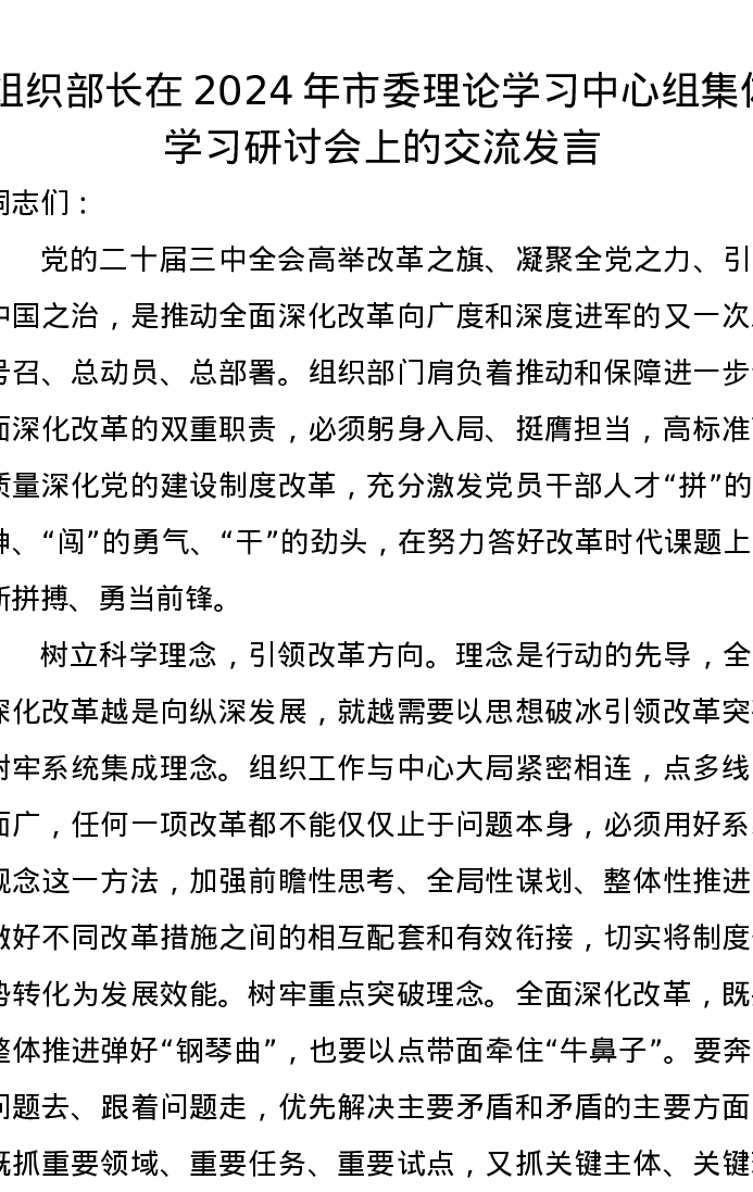 组织部长在2024年市委理论学习中心组集体学习研讨会上的交流发言