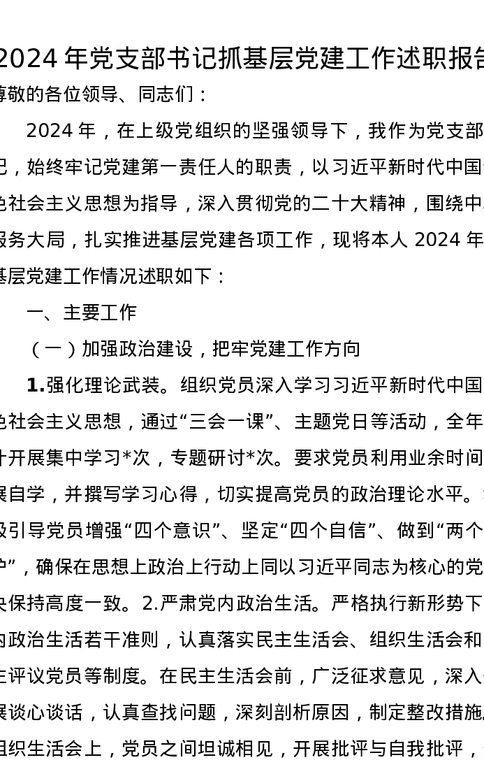 2024年党支部书记抓基层党建工作述职报告