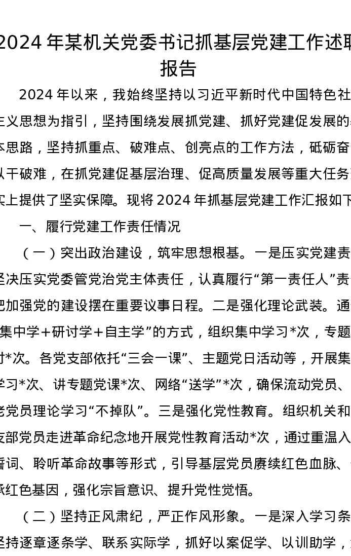 2024年某机关党委书记抓基层党建工作述职报告