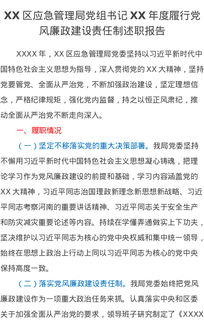 XX区应急管理局党组书记XX年度履行党风廉政建设责任制述职报告