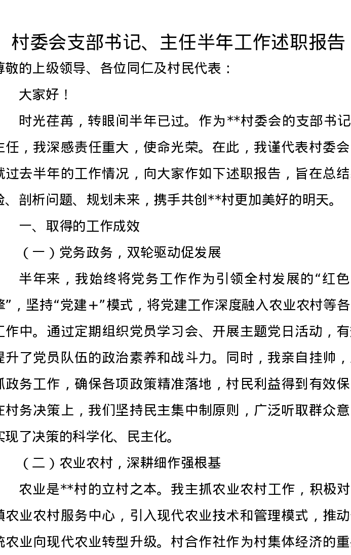 村委会支部书记、主任半年工作述职报告