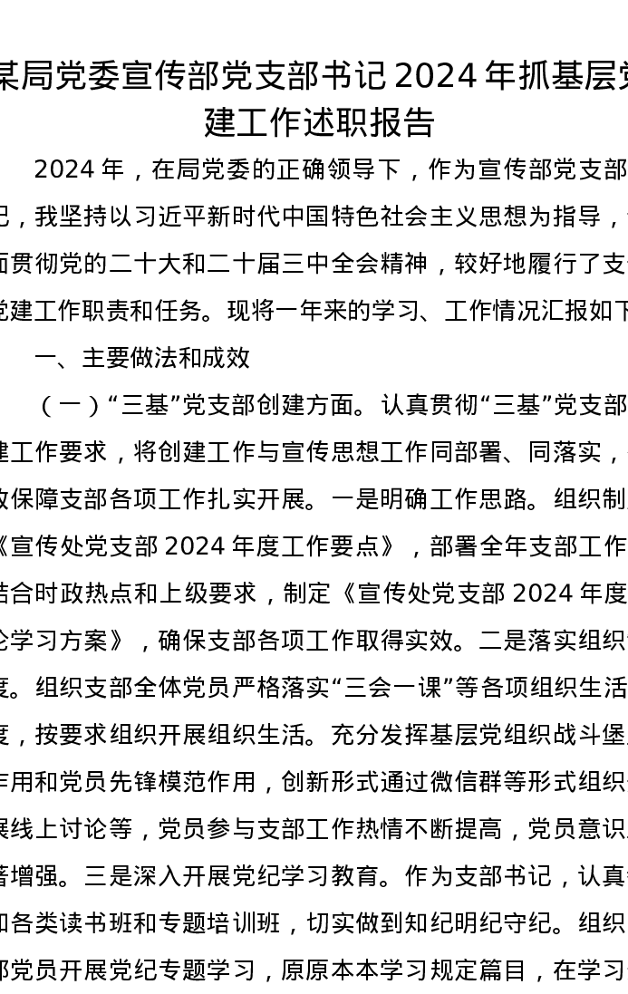 某局党委宣传部党支部书记2024年抓基层党建工作述职报告