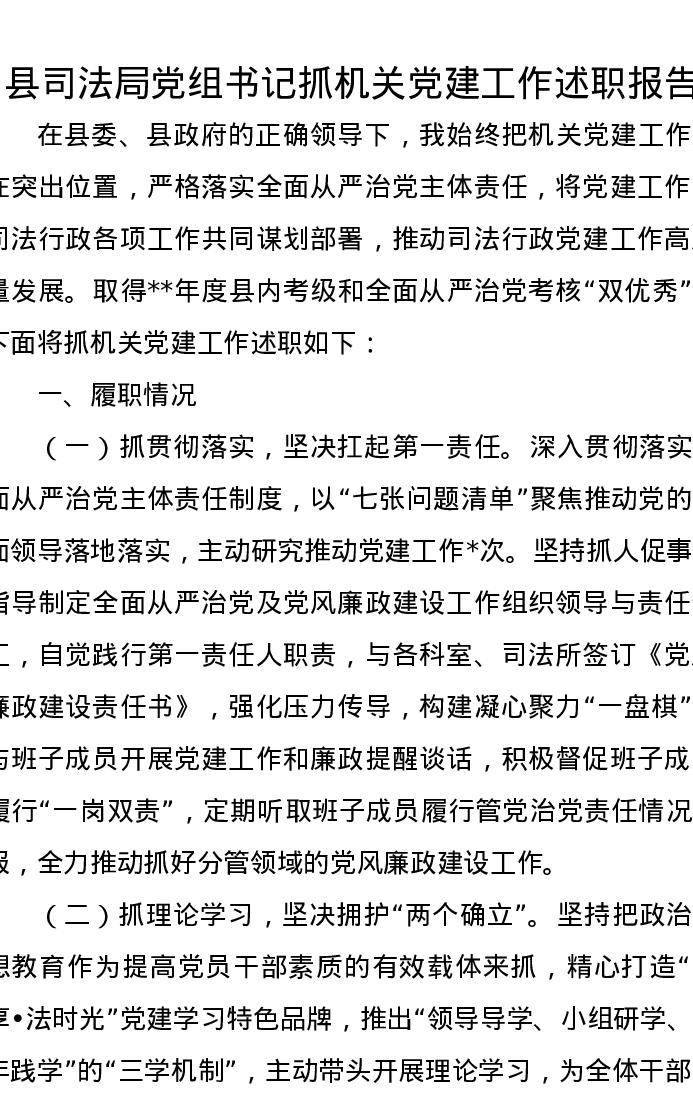 县司法局党组书记抓机关党建工作述职报告