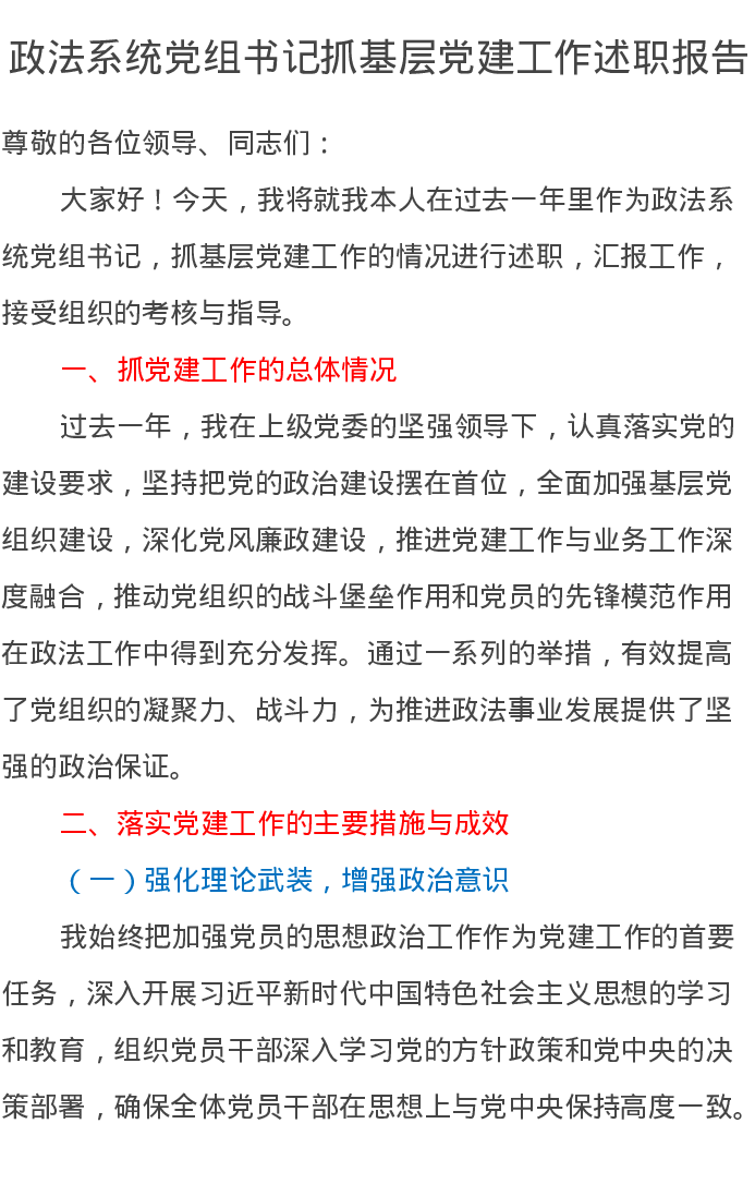 政法系统党组书记2024年抓基层党建工作述职报告