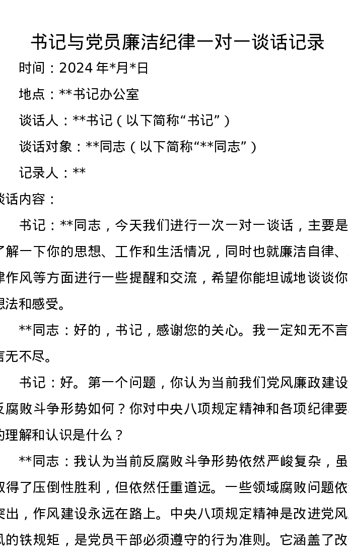 书记与党员廉洁纪律一对一谈话记录