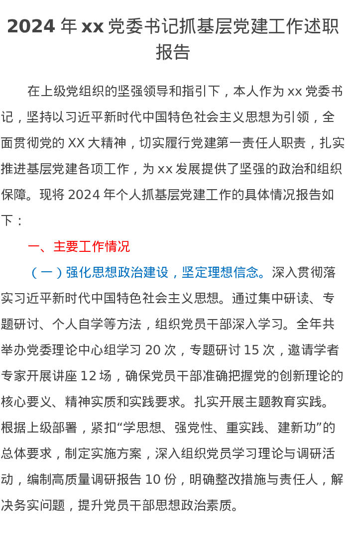 2024年xx党委书记抓基层党建工作述职报告