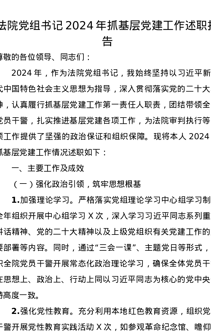 法院党组书记2024年抓基层党建工作述职报告