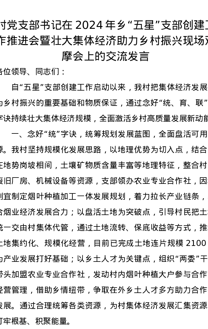 村党支部书记在2024年乡“五星”支部创建工作推进会暨壮大集体经济助力乡村振兴现场观摩会上的交流发言