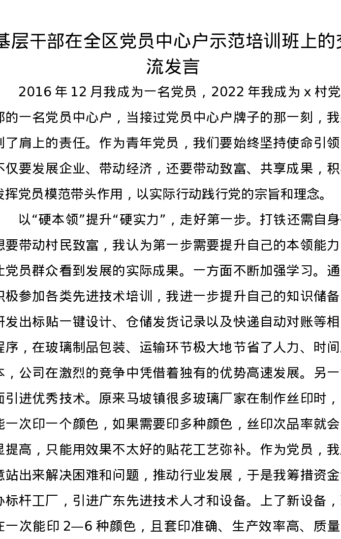 基层干部在全区党员中心户示范培训班上的交流发言