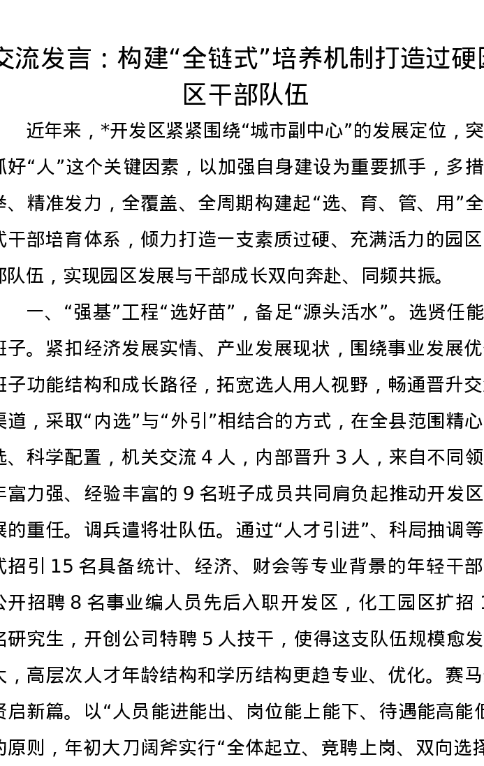 交流发言:构建“全链式”培养机制,打造过硬园区干部队伍