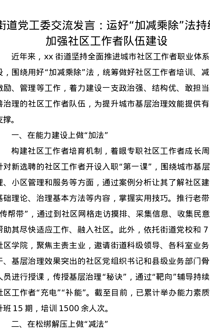 街道党工委交流发言:运好“加减乘除”法持续加强社区工作者队伍建设