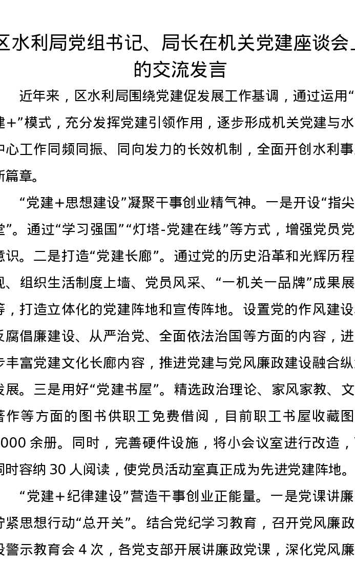 区水利局党组书记、局长在机关党建座谈会上的交流发言