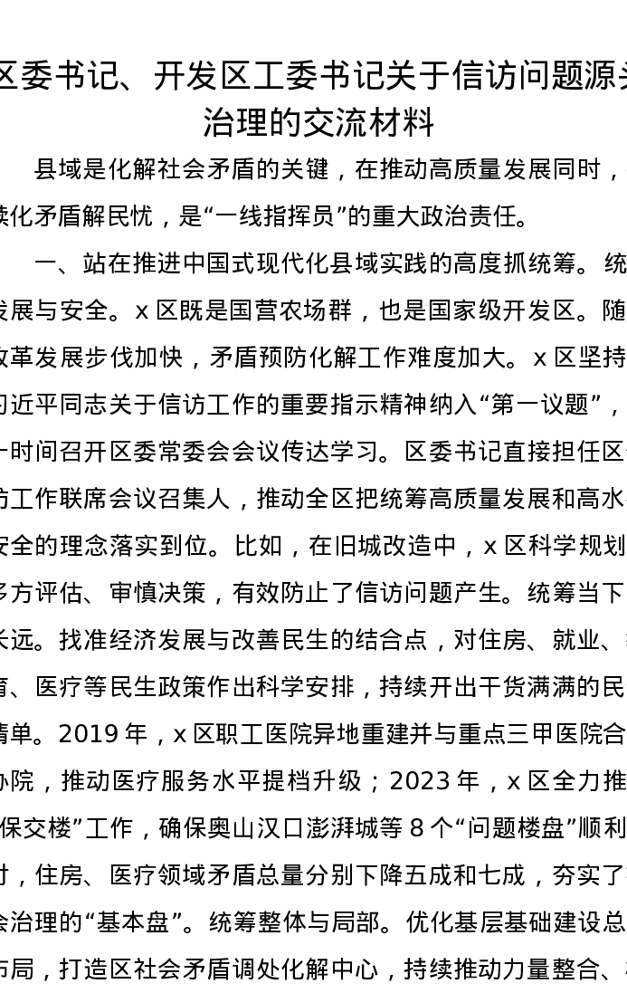 区委书记、开发区工委书记关于信访问题源头治理的交流发言材料