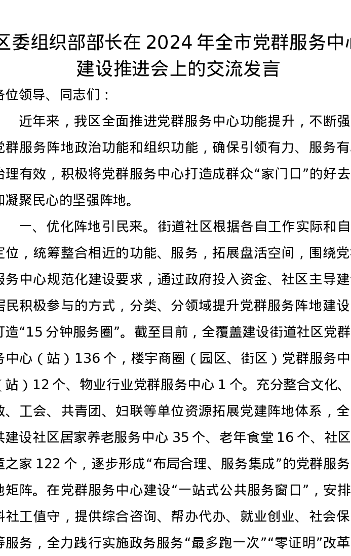 区委组织部部长在2024年全市党群服务中心建设推进会上的交流发言