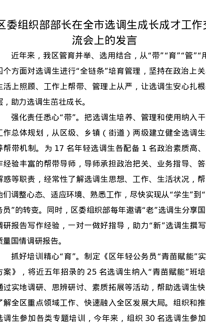区委组织部部长在全市选调生成长成才工作交流会上的发言