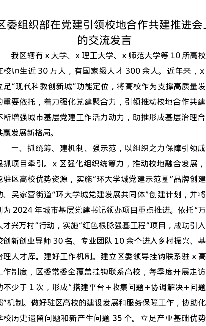 区委组织部在党建引领校地合作共建推进会上的交流发言