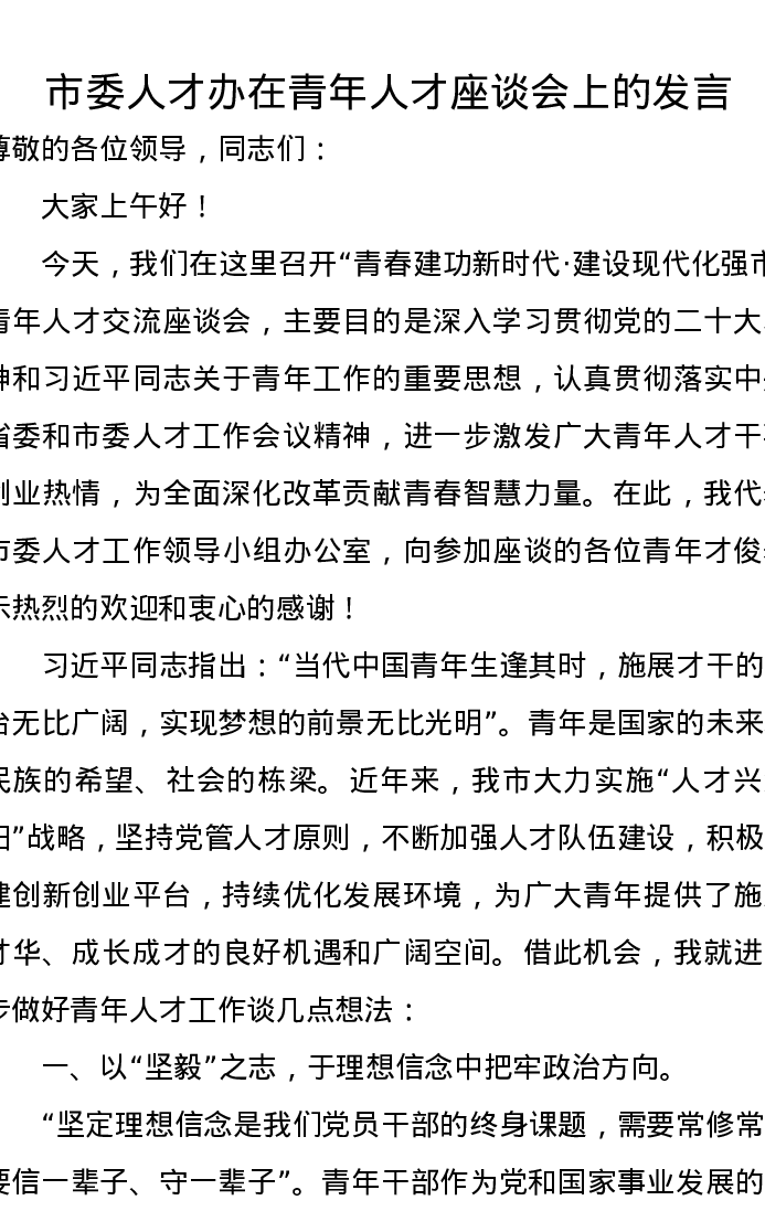 市委人才办在青年人才座谈会上的发言