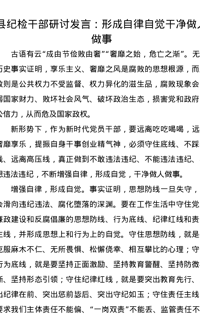 县纪检干部研讨发言:形成自律自觉,干净做人做事