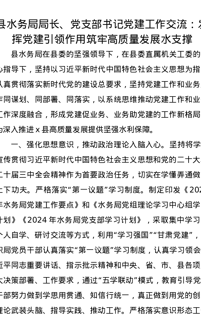 县水务局局长、党支部书记党建工作交流发言:发挥党建引领作用,筑牢高质量发展水支撑