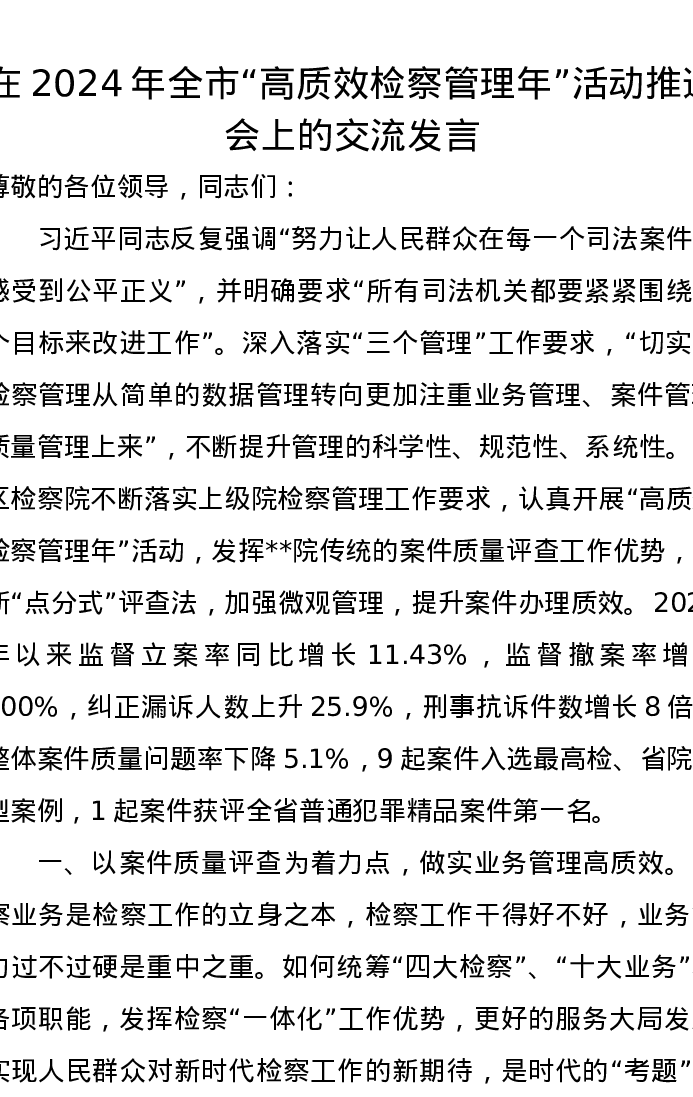 在2024年全市“高质效检察管理年”活动推进会上的交流发言