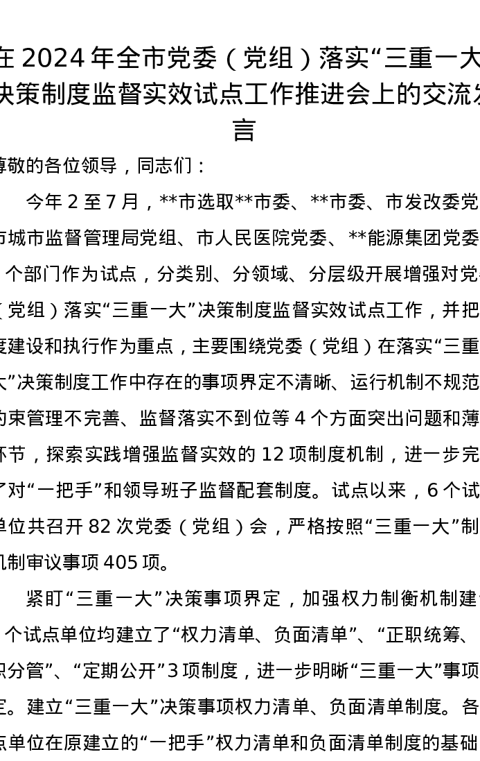 在2024年全市党委(党组)落实“三重一大”决策制度监督实效试点工作推进会上的交流发言