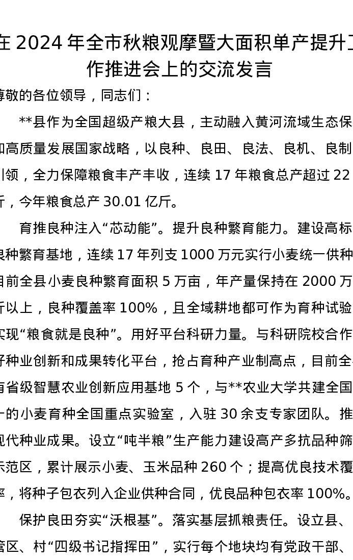 在2024年全市秋粮观摩暨大面积单产提升工作推进会上的交流发言