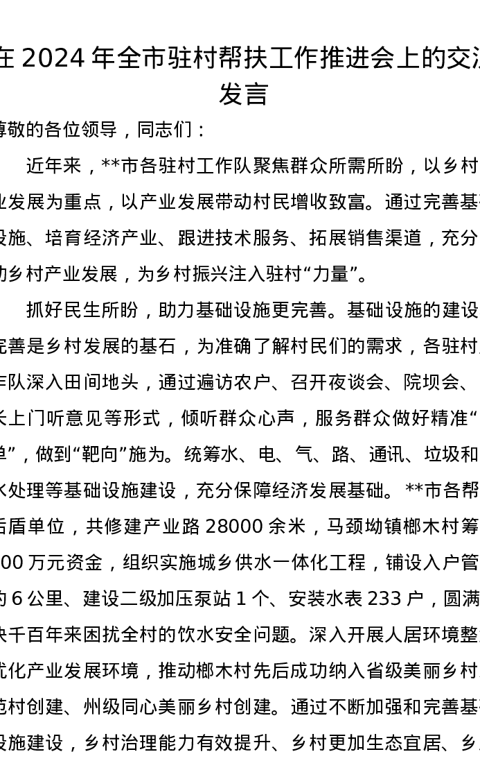 在2024年全市驻村帮扶工作推进会上的交流发言