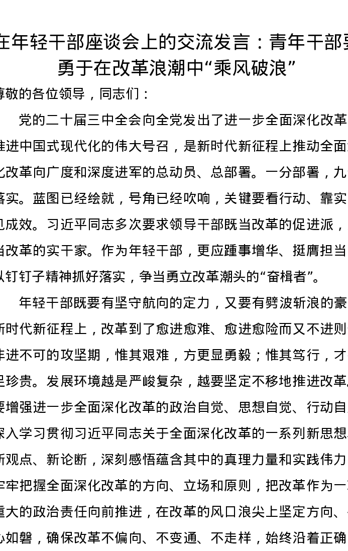 在年轻干部座谈会上的交流发言:青年干部要勇于在改革浪潮中“乘风破浪”