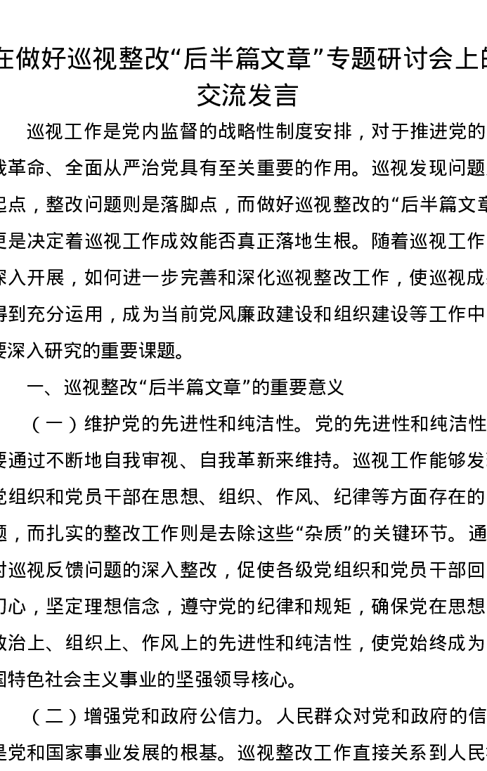 在做好巡视整改“后半篇文章”专题研讨会上的交流发言