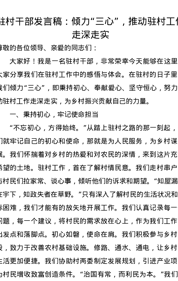 驻村干部发言稿:倾力“三心”,推动驻村工作走深走实