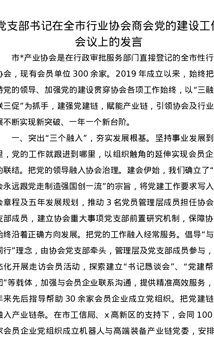 党支部书记在全市行业协会商会党的建设工作会议上的发言