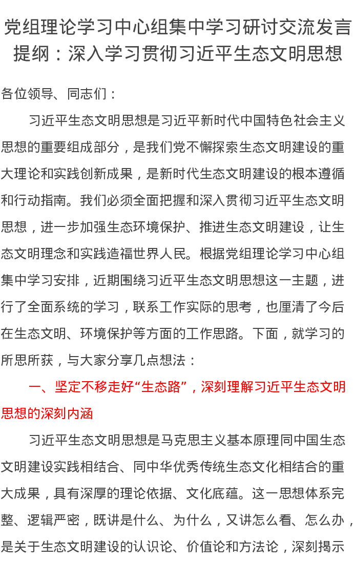 党组理论学习中心组集中学习研讨交流发言提纲:深入学习贯彻习近平生态文明思想