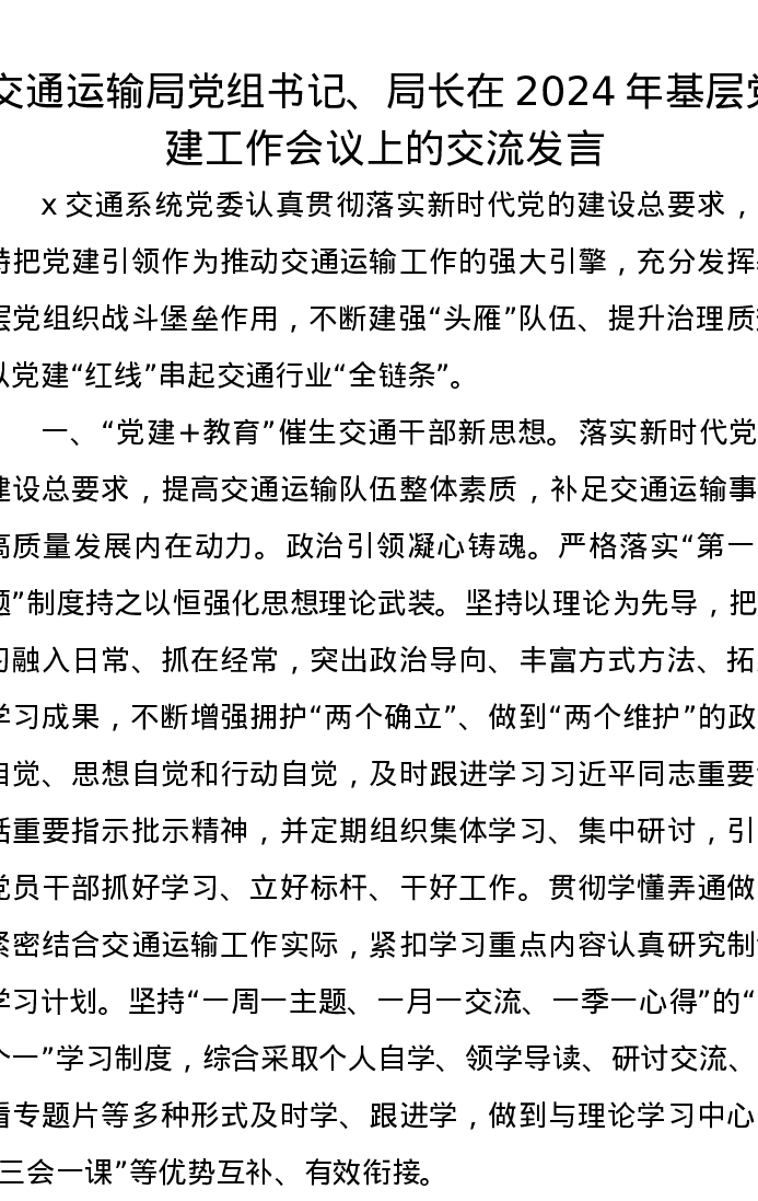 交通运输局党组书记、局长在2024年基层党建工作会议上的交流发言