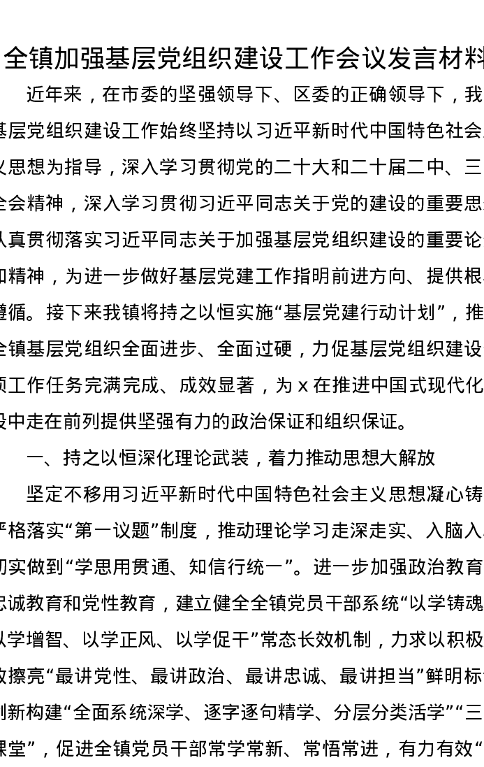 全镇加强基层党组织建设工作会议发言材料