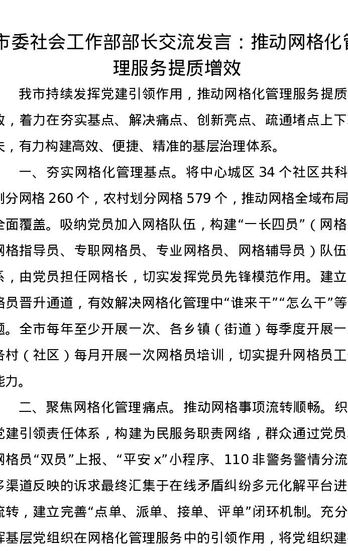 市委社会工作部部长交流发言:推动网格化管理服务提质增效