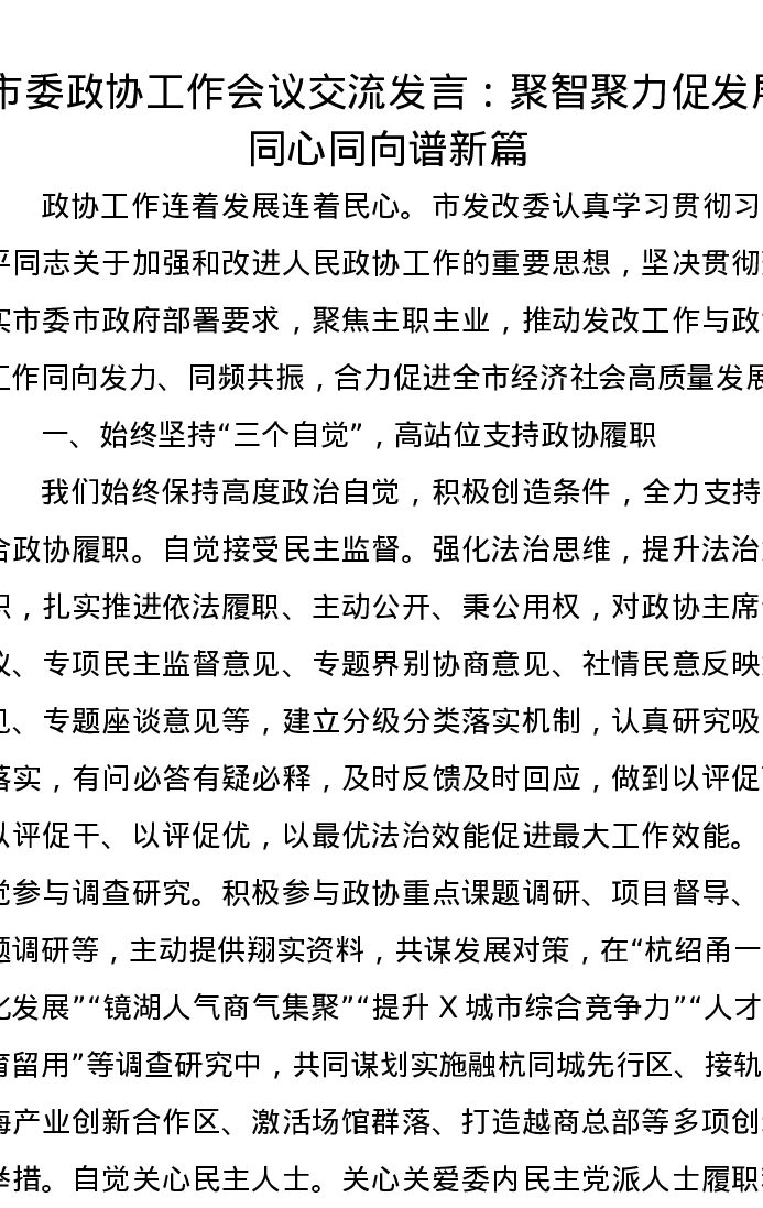 市委政协工作会议交流发言:聚智聚力促发展,同心同向谱新篇