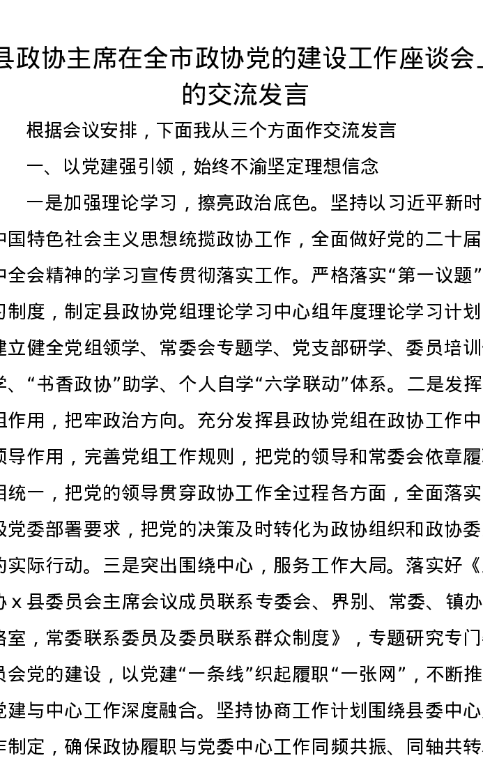 县政协主席在全市政协党的建设工作座谈会上的交流发言