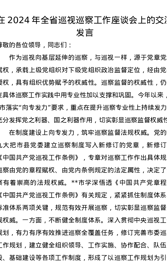 在2024年全省巡视巡察工作座谈会上的交流发言