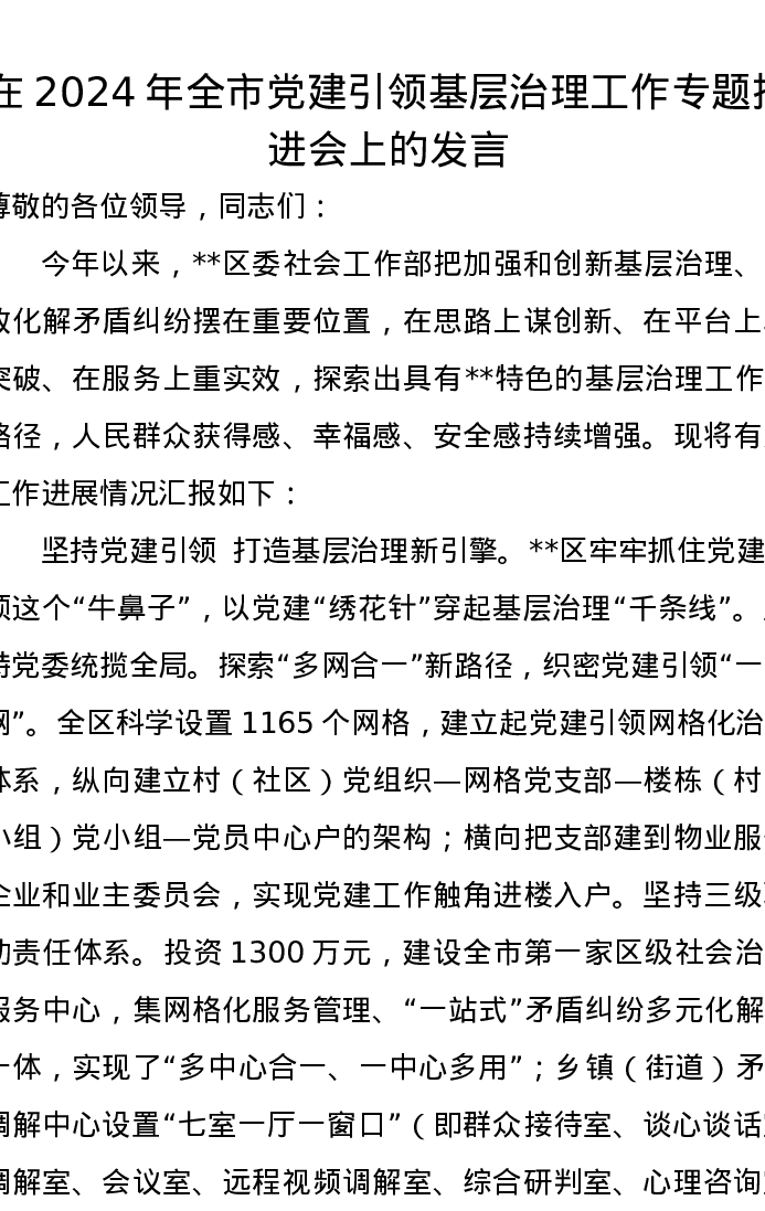 在2024年全市党建引领基层治理工作专题推进会上的发言