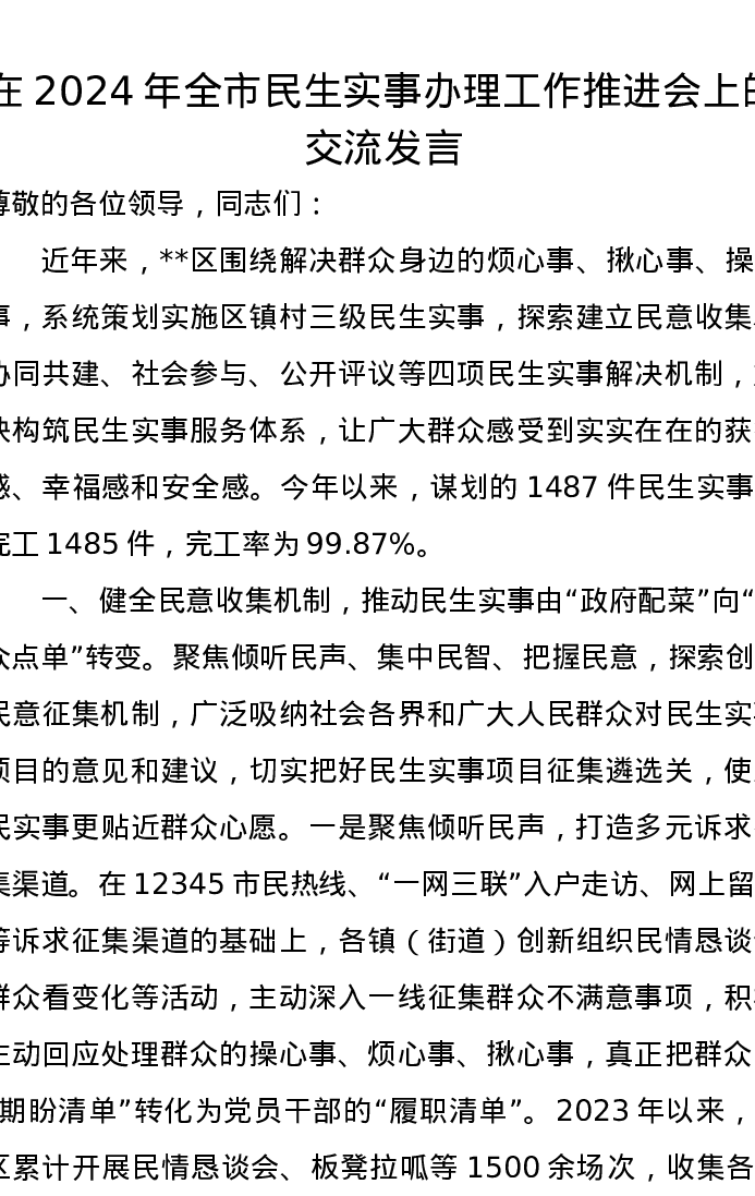 在2024年全市民生实事办理工作推进会上的交流发言
