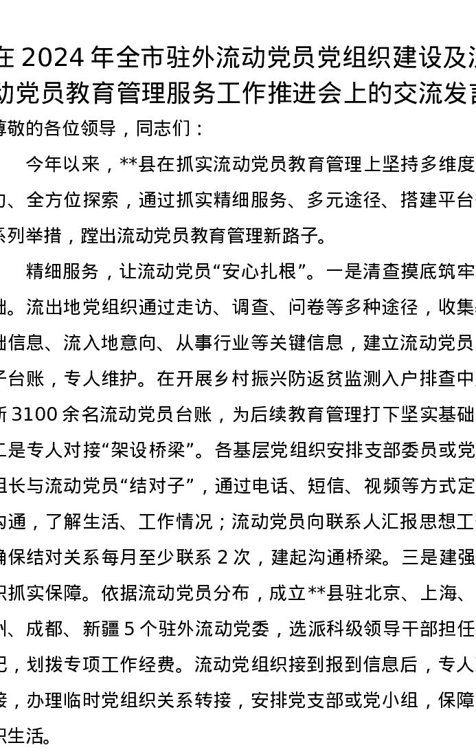 在2024年全市驻外流动党员党组织建设及流动党员教育管理服务工作推进会上的交流发言
