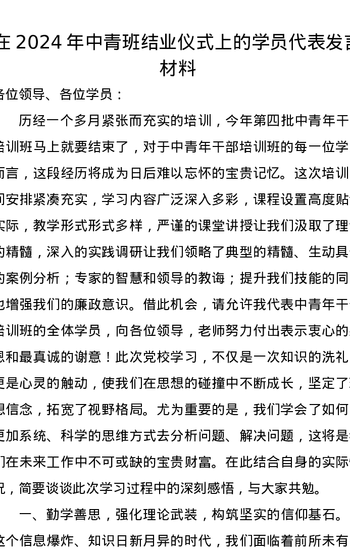 在2024年中青班结业仪式上的学员代表发言材料