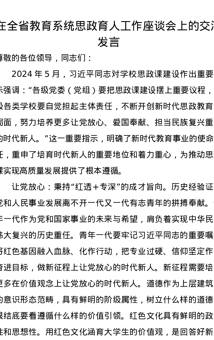 在全省教育系统思政育人工作座谈会上的交流发言