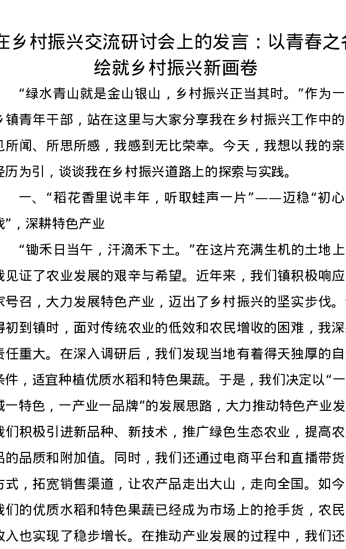 在乡村振兴交流研讨会上的发言:以青春之名,绘就乡村振兴新画卷